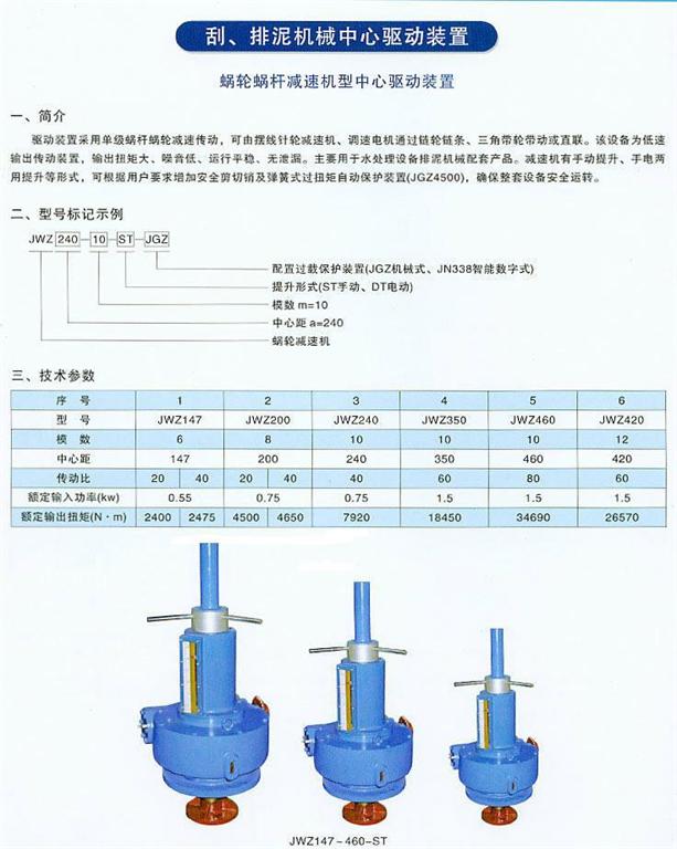 JWZ刮泥機驅動裝置采用單級蝸桿蝸輪減速傳動,可由擺線針輪減速機、調速電機通過鏈輪鏈條、三角帶輪帶動或直聯。該設備為低速輸出傳動裝置,輸出扭矩大、噪音低、運行平穩、無泄漏。主要用于水處理設備排泥機械配套產品。減速機有手動提升、手電兩用提升的等形式,可根據用戶要求增加安全剪切銷及彈簧式過扭矩自動保護裝置(JGZ4500),確保整套設備安全運轉。